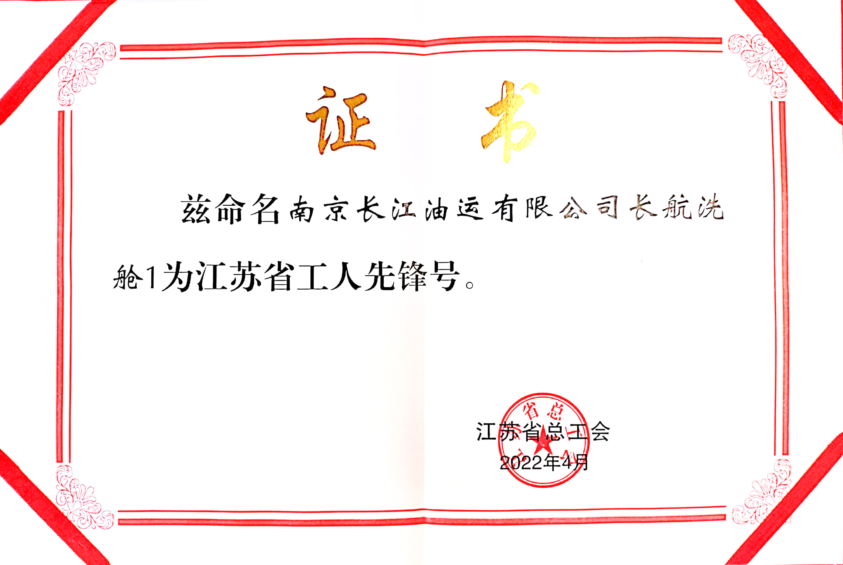 2022年,中国长航“长航洗舱1”获“江苏省工人先锋号”命名