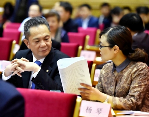 全国人大代表张锐(左)与全国人大代表杨琴热议政府工作报告。本报记者程丁摄(见 检察日报 2019年3月6日)