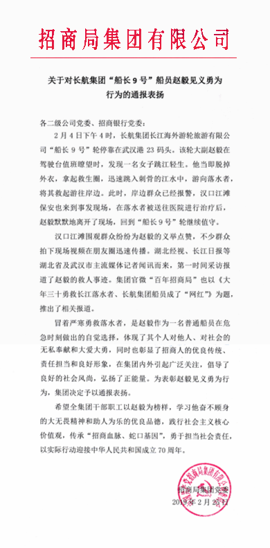 3月4日,长航集团收到来自招商局集团党委的一封通报表扬信,信中对“船长9号”船员赵毅大年三十勇救跳江轻生女的行为提出表扬,并号召全集团干部职工以赵毅为榜样,学习他奋不顾身的大无畏精神和助人为乐的优良品德,践行社会主义核心价值观,传承“招商血脉,蛇口基因”,勇于担当社会责任,以实际行动迎接中华人民共和国成立70周年。