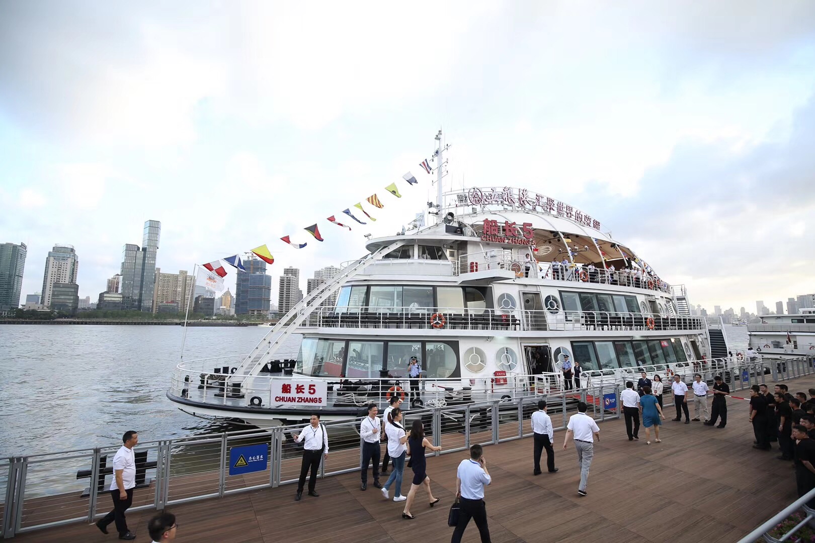 18时20分,“船长5”号满载宾客驶离秦皇岛路码头,驶向外滩水域。与此同时,欢迎仪式在游船三楼开放式甲板举行,上海市交通委和虹口区相关领导致欢迎辞,随后“船长5”号为嘉宾们提供了自助晚餐及观景、交流、合影等服务。活动圆满结束后,“船长5”号因其出色服务获得了在场宾客和活动承办方的高度评价。